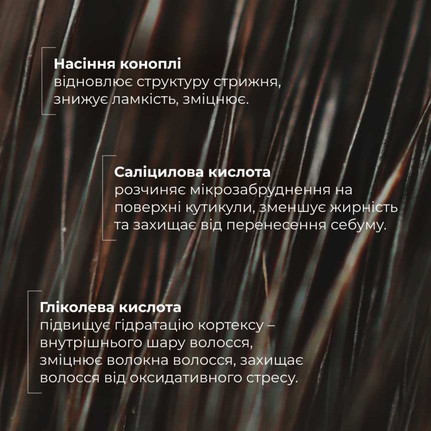 Формула збагачена гідролізованими білками рису та насіння коноплі, які діють як реструктуризуючі агенти – проникають у стрижень волосини, заповнюючи порожнечі й ущільнюючи структуру. М’яка силіконова основа створює невагому захисну плівку, що пригладжує кутикулу, надає дзеркального блиску та захищає від термічного і механічного пошкодження.