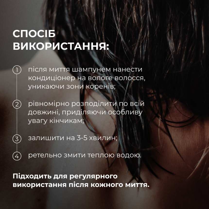 Спосіб застосування: після миття шампунем нанести кондиціонер на вологе волосся, уникаючи зони коренів. Рівномірно розподілити по всій довжині, приділяючи особливу увагу кінчикам. Залишити на 3-5 хвилин для глибшого впливу, після чого ретельно змити водою.