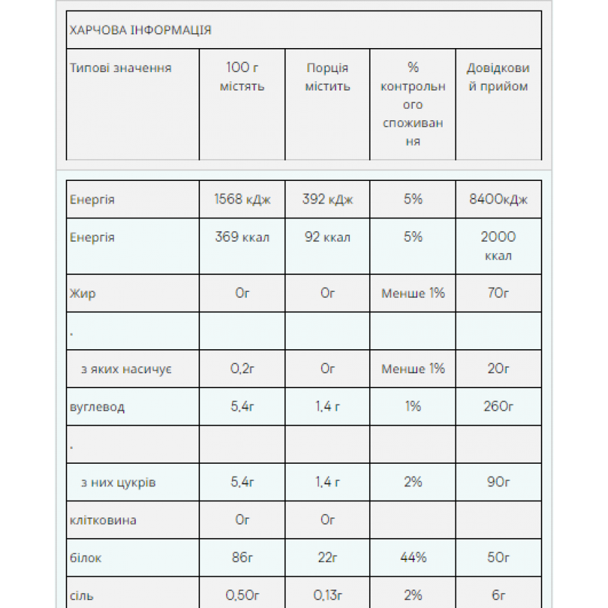 Розмір порції - 1 мірна ложка (25г) Порцій в упаковці - 40 (1кг), 100 (2.5кг), 160 (4кг) Поживна Цінність У 100г У порції (25г) 0.3 г 0.1 г з яких насичених 0.3 г 0.1 г Вуглеводів 2.5 г 0.6 г з яких цукру 2.5 г 0.6 г Білка 90 г 23 г Солі 0.50 г 0.13 г
