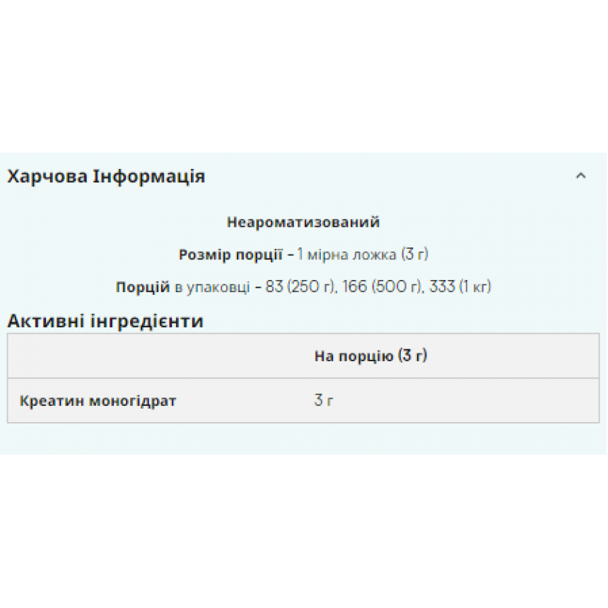 Переваги моногідрату креатину Креатин моногідрат допомагає тілу виробляти підвищений рівень АТФ – молекул, необхідних для ефективного скорочення м'язів. Підвищений рівень АТФ може призвести до збільшення сили, потужності та витривалості. Креатин моногідрат має найкращий смак і є найбільш гнучкою формою креатину, доступною на ринку. Він абсолютно надійний та корисний, не має побічних ефектів завдяки тому, що є натуральною складовою червоного м'яса.