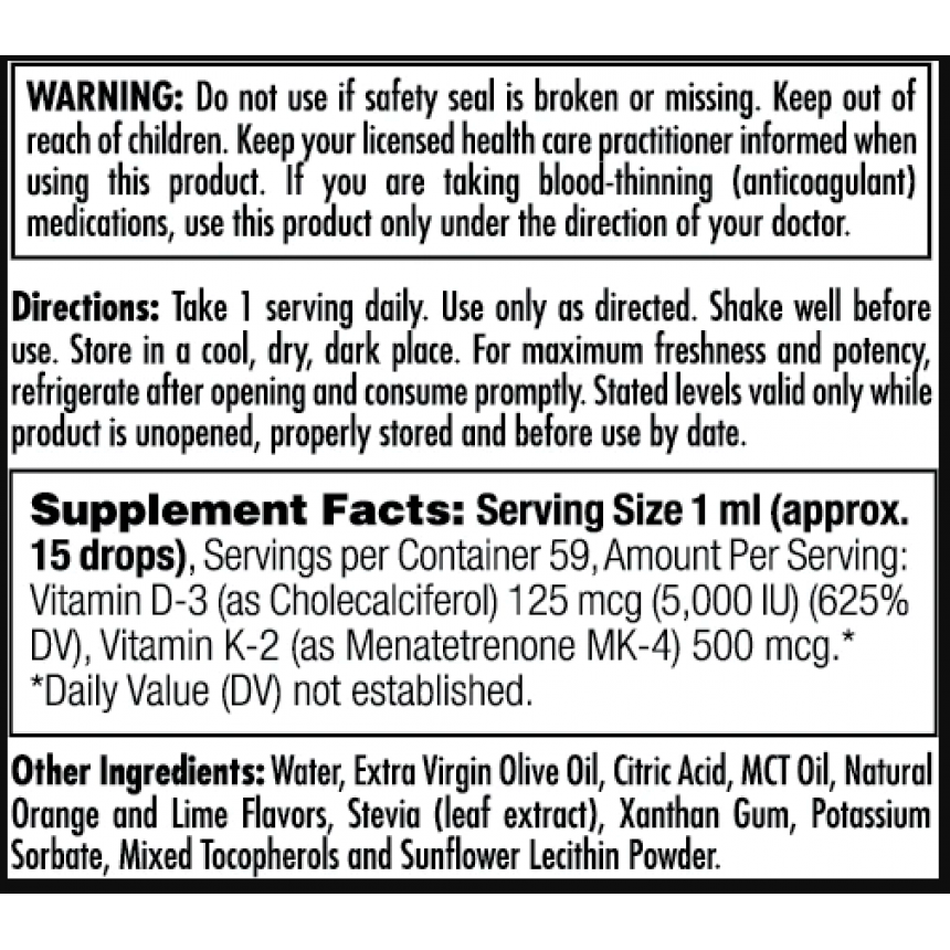 Інформація про продукт. KAL ® D-3 K-2 DropIns ™ — це формула рідкої емульсії з натуральним цитрусовим смаком. Просто капни до рота. Порція в 1 мл за ефективністю еквівалентна приблизно 15 краплям або 1 піпетці.