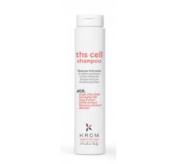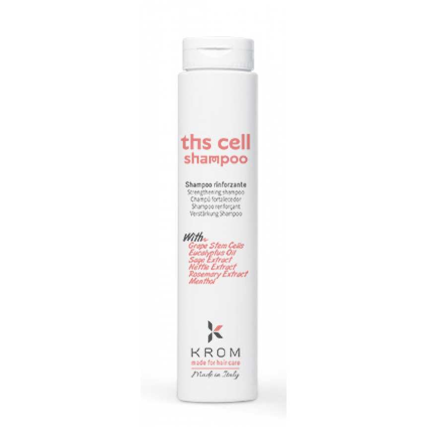 Для ефективної боротьби з випадінням волосся професіонали італійського бренда розробили унікальну формулу, на основі якої виготовлений зміцнювальний шампунь Krom Ths Cell Shampoo. Його шовковиста піна делікатно усуває забруднення, відмерлі клітини, себум і патогенні мікроорганізми зі шкіри голови. Засіб підтримує оптимальний рівень зволоженості епідермісу, глибоко живить і дбайливо заспокоює його. Він покращує мікроциркуляцію крові, зміцнює і пробуджує волосяні фолікули.