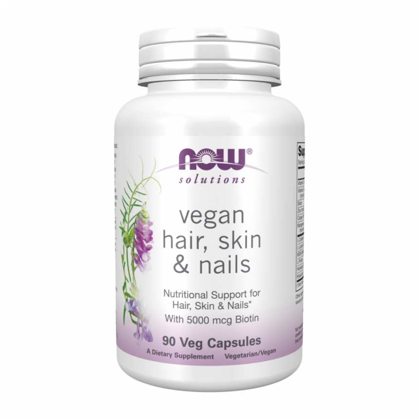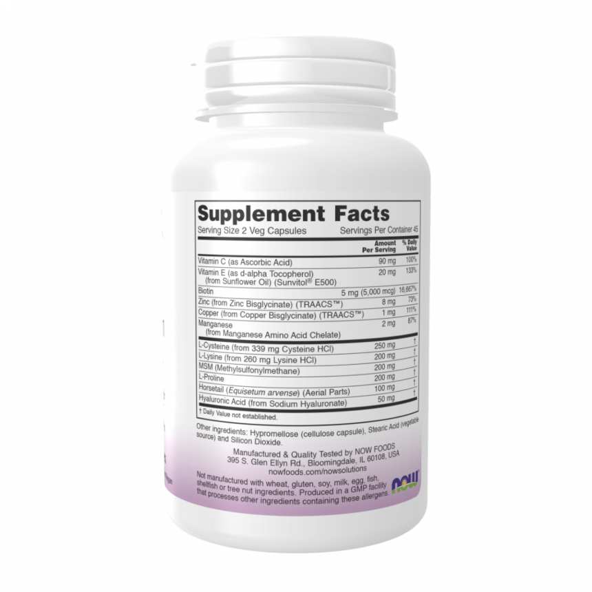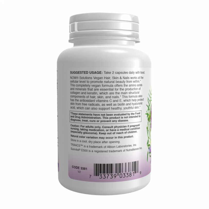 Добавка для здоров’я волосся, шкіри та нігтів від NOW® Solutions працює на клітинному рівні, допомагаючи підтримати природну красу зсередини. Ця повністю веганська формула містить амінокислоти і мікроелементи, які необхідні для вироблення колагену і кератину — основних структурних компонентів волосся, шкіри та нігтів. Крім того, до складу включені антиоксидантні вітаміни C і E, які допомагають захистити шкіру від вільних радикалів, а також біотин і гіалуронова кислота, які підтримують здоров’я і молодість шкіри.