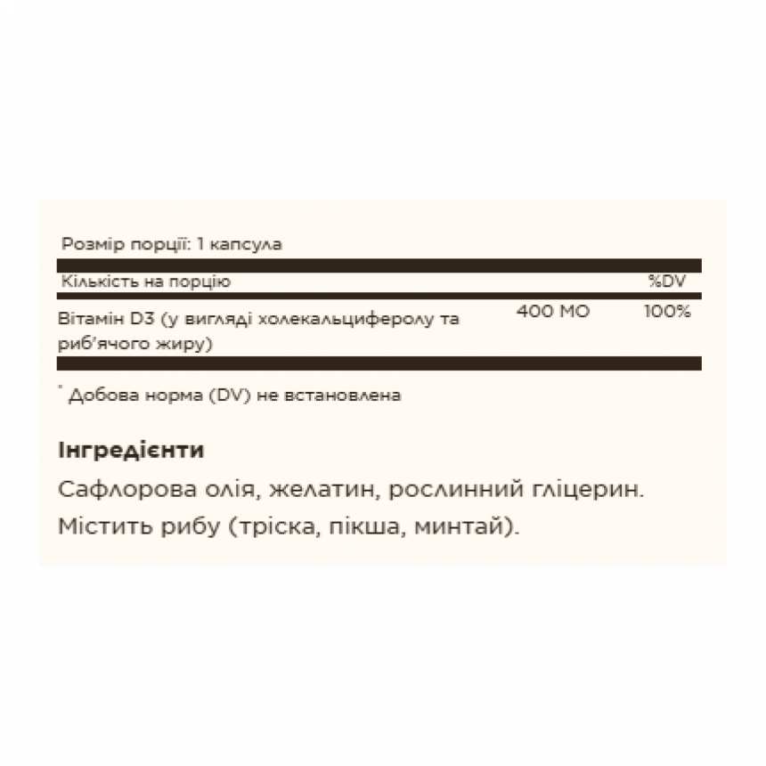 Вітамін D — це жиророзчинний вітамін, який сприяє засвоєнню кальцію, що сприяє підтримці здорових кісток і зубів. Вітамін D також підтримує здорову імунну систему. У цьому продукті використовується масло з печінки глибоководних холодноводних риб. Масло було очищено для усунення ртуті та ПХБ. Ця формула пропонується в м’яких капсулах на масляній основі для сприяння оптимальному поглинанню та засвоєнню.